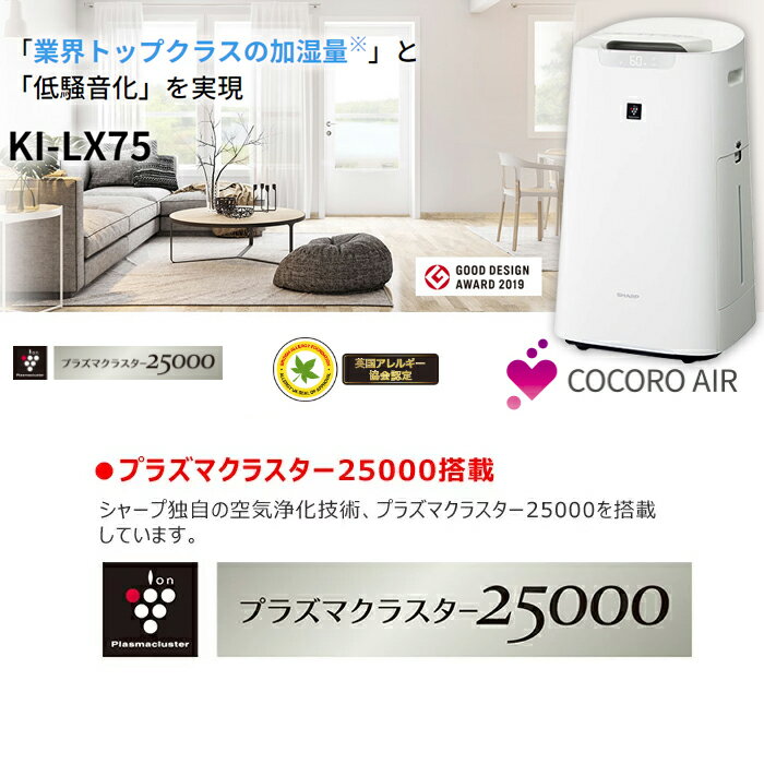 ● 品名 加湿空気清浄機 KI-LX75-W カラー:ホワイト系 ● おすすめ畳数 〜21畳 ● 最大加湿量 880 mL/h ● 最大風量 7.5 m3/分 ● 浄化方式 「プラズマクラスター25000」 空中浄化&フィルター浄化 ● 待機時 消費電力 約0.7 W ● 寸法 幅400×奥行359×高さ693 質量:約12 Kg ● 電源コード 1.8 m ● 独自気流 スピード循環気流 ● センサー ホコリ / ニオイ / 湿度 / 温度 / 照度 ● モニター PM2.5濃度デジタル表示(目安)/ デジタル温度・ 湿度・電気代モニター / きれいモニター / ニオイモニター ● 適用畳数 プラズマクラスター25000 ・約21畳 空気清浄 ・〜34畳 加湿(プレハブ洋室) ・〜21畳 加湿(木造和室) ・〜12.5畳 ※返品不可 こちらの商品は ★